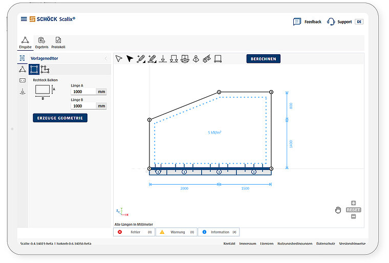 Tento modul umožňuje navrhnúť samotnú balkónovú dosku – jej tvar, rozmery a výstuž. Používateľ zadáva rozmery, typ zaťaženia a tvar dosky. Softvér zároveň navrhuje vhodné produkty Schöck Isokorb® pre danú konštrukciu a vizualizuje ich umiestnenie v 2D náhľade.