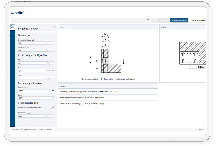 Softvér umožňuje zadať výšku atiky, hrúbku dosky a ďalšie parametre, na základe ktorých vypočíta vhodné usporiadanie izolačných a nosných prvkov. Návrh sa opiera o produkty Schöck Isokorb® CXT.