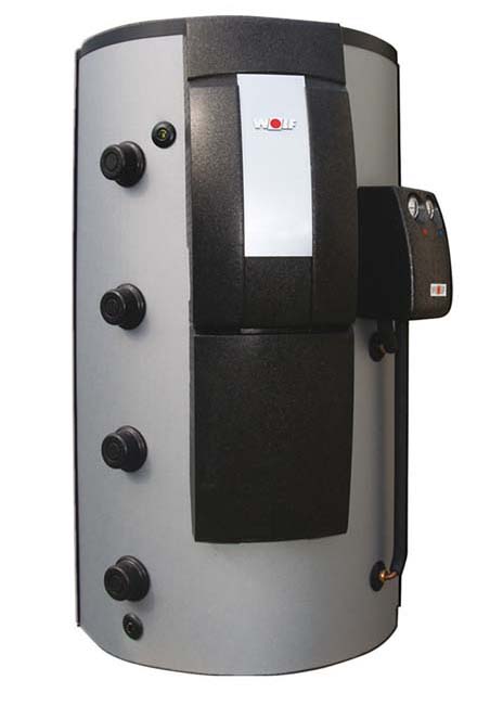 Skutočným vrstvovým akumulačným zásobníkom vody je zásobník Wolf typu BSP, ktorý využíva na prietokový ohrev pitnej vody doskový výmenník tepla patričnej dimenzie. Spolu s ďalším príslušenstvom je v ucelenom tepelne izolovanom bloku upevnenom na hornej časti zásobníka. Primárne čerpadlo, ktoré sa spúšťa pri odbere teplej vody, ťahá horúcu ohrievaciu vodu z najvyššej vrstvy zásobníka. Termostatický zmiešavač pritom udržiava jej teplotu na vstupe do doskového výmenníka na takej úrovni, abysa pretekaná pitná vodazohriala na nastavenú teplotu. Stačí na to aj minimálna vrstva horúcej vody v zásobníku, celý objem pod ňou môže byť úplne studený.